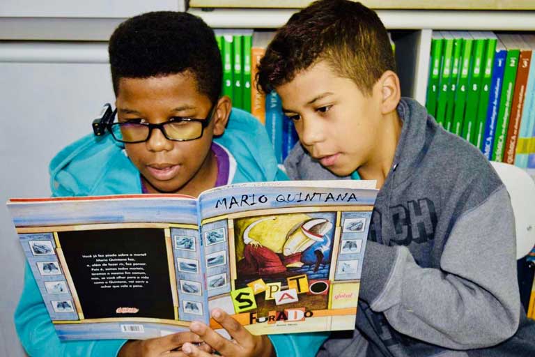 Na foto acima: Alunos com deficiência visual da rede pública municipal de São Paulo leem livro com auxílio do dispositivo OrCam MyEye 2.